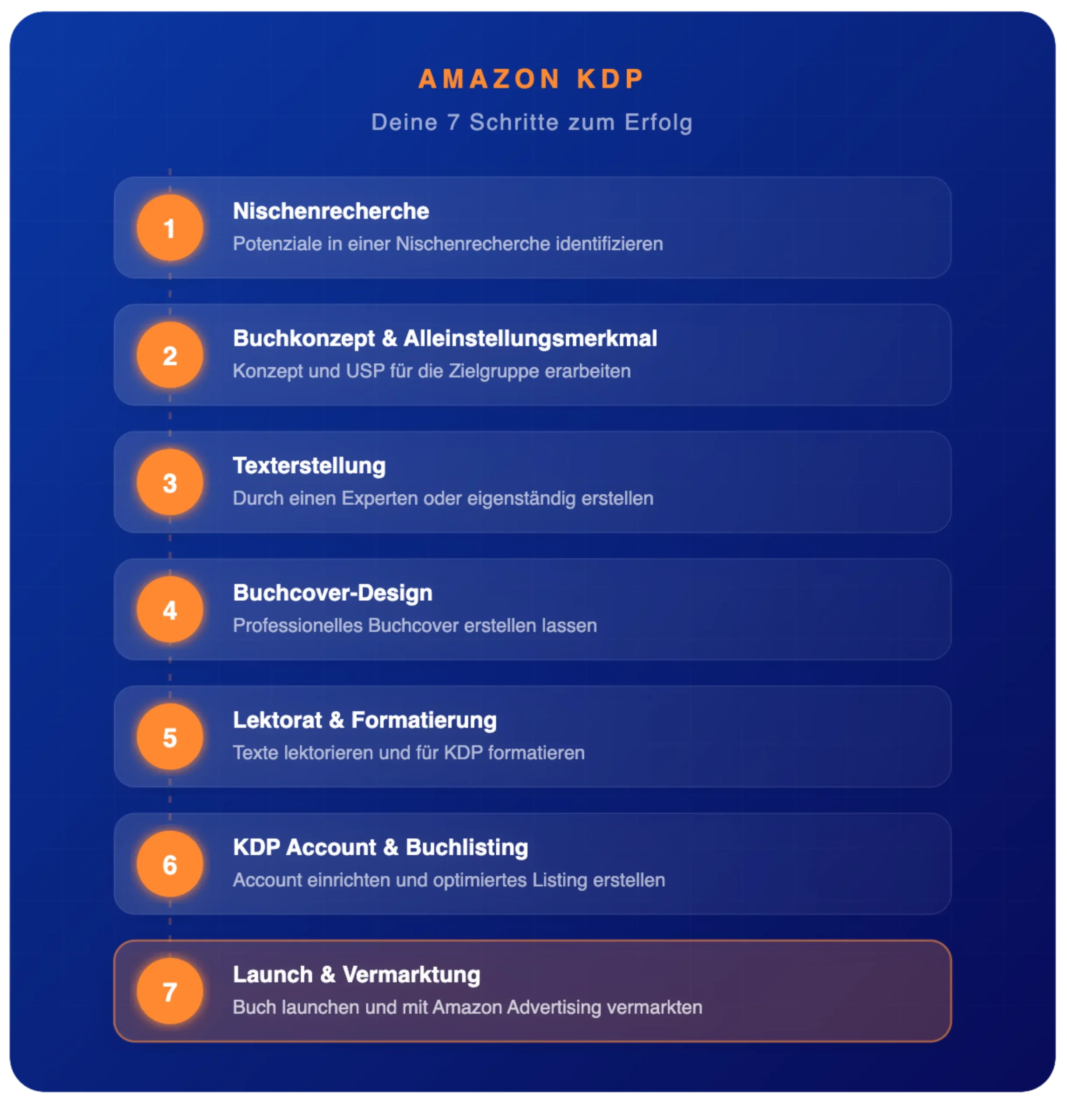 Folgende Schritt muss man als Kindle Publisher gehen, um ein Buchprojekt als eBook erfolgreich abzuwickeln: